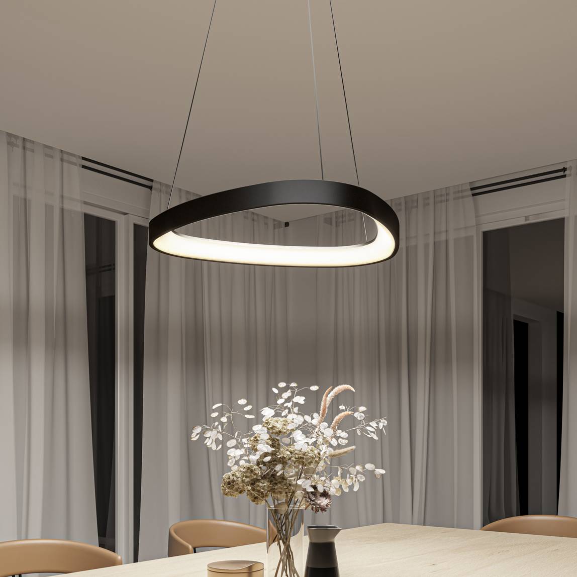 A modern dining area featuring a round wooden table for four, black chairs, a Haze modern 3-light glass pendant by Artika above, a textured black wall, and a large green plant on the right.