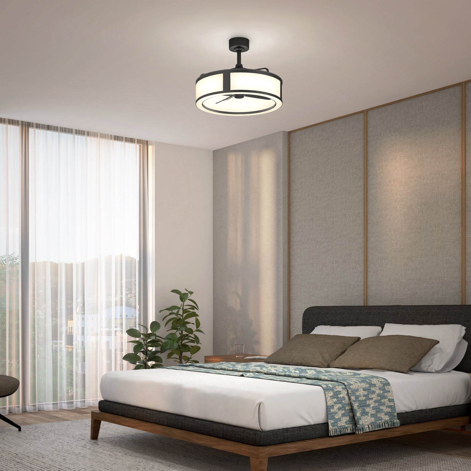 A modern living room features a gray sofa, round armchair, small black coffee table, wall art, potted plant, and the Artika Horizon 23 in. LED modern ceiling fan with remote. Large windows with blinds fill the space with natural light.