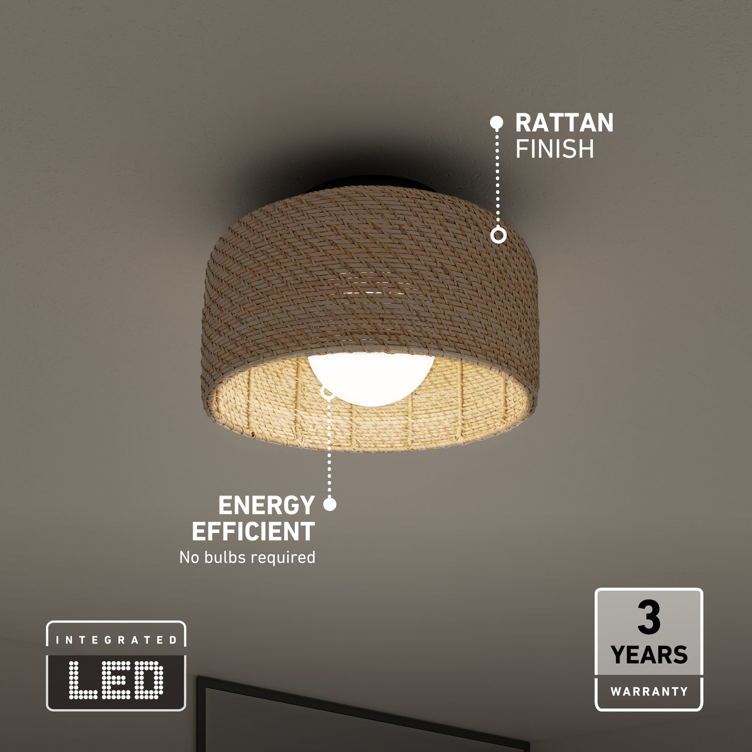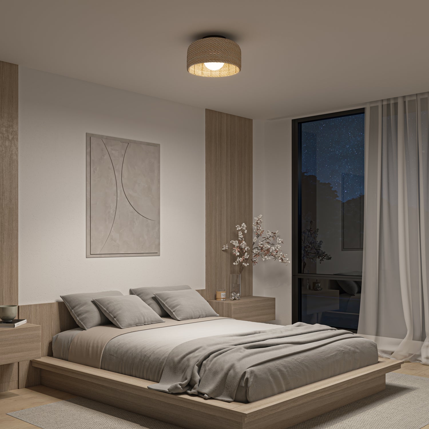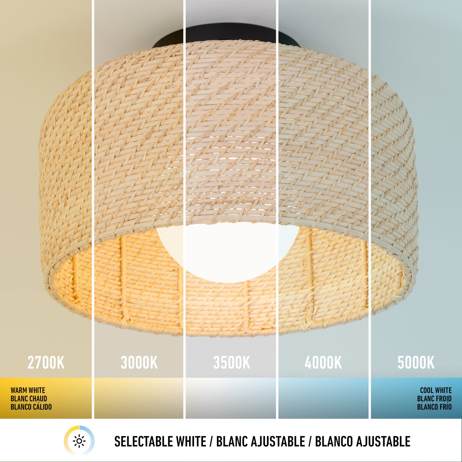 Esta moderna lámpara de techo con luz led integrada con pantalla de mimbre es perfecta para todos los decorados de estilo contemporáneo, escandinavo o con toques retro. Su aspecto natural brindará suficiente iluminación a los dormitorios, salón, oficina o rincón de descanso dándoles al mismo tiempo, calidez y suavidad. Adopta la forma de una bombilla redonda de gran tamaño, con un difusor que completa el conjunto con armonía. Los 1200 lúmenes de esta lámpara iluminan piezas de tamaño pequeño o mediano. Puede regular su intensidad acoplándola a un regulador de luz led compatible. Posee la tecnología de luz blanca ajustable que permite escoger entre las 5 opciones de tono de blanco que desee. Vida útil: 50 000 horas.