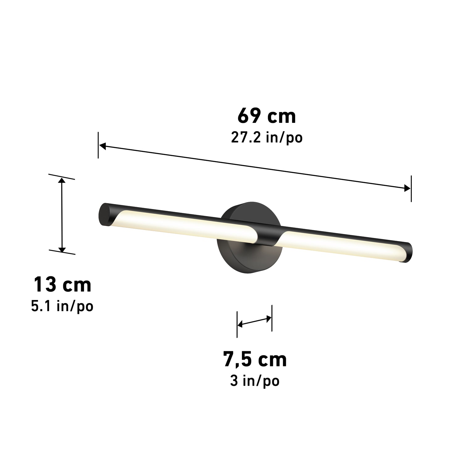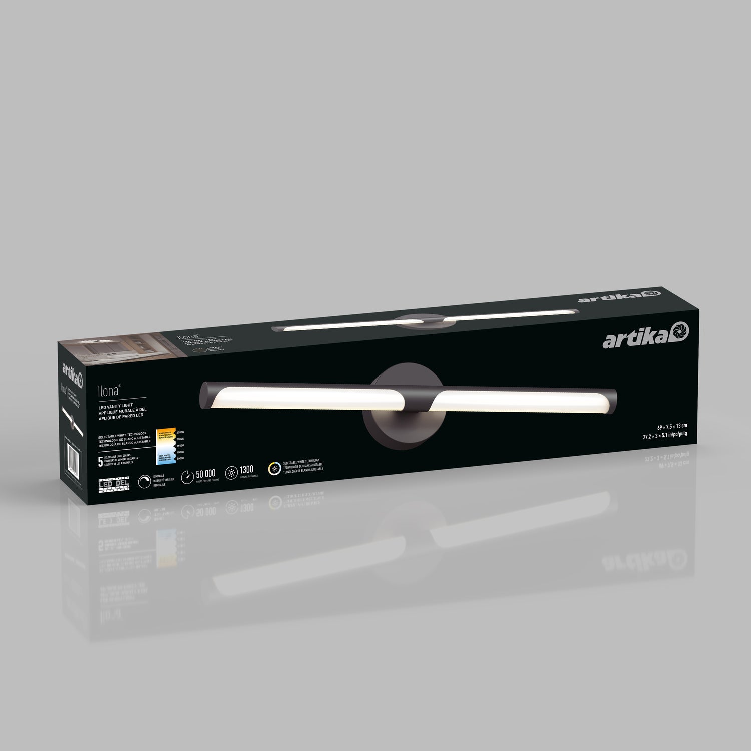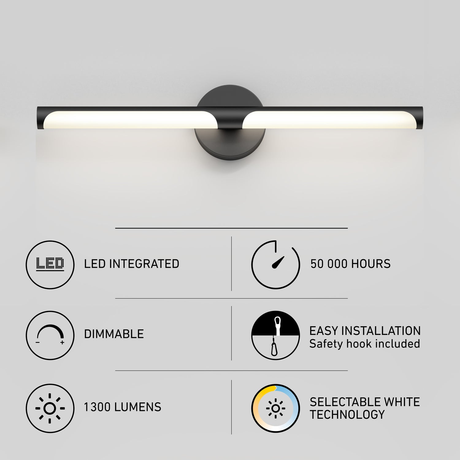 Este aplique de pared con luz led Ilona integrada de forma tubular es el aliado perfecto a la hora de arreglarse. Cuando se instala encima del espejo del baño emite una potente iluminación muy favorecedora. Sus 1300 lúmenes brindan la luminosidad que necesita para ver bien. Puede acoplar el aplique a un regulador de luz led compatible para obtener una iluminación de ambiente relajante para un baño de espuma. Colores de luz ajustables. Vida útil: 50 000 horas.