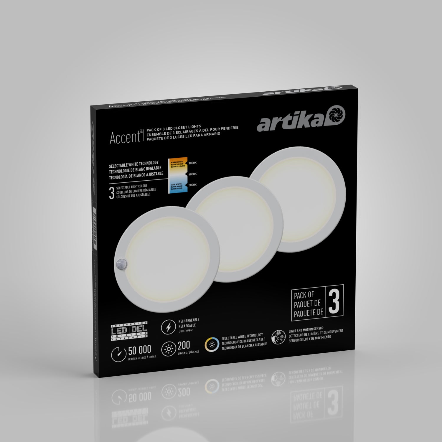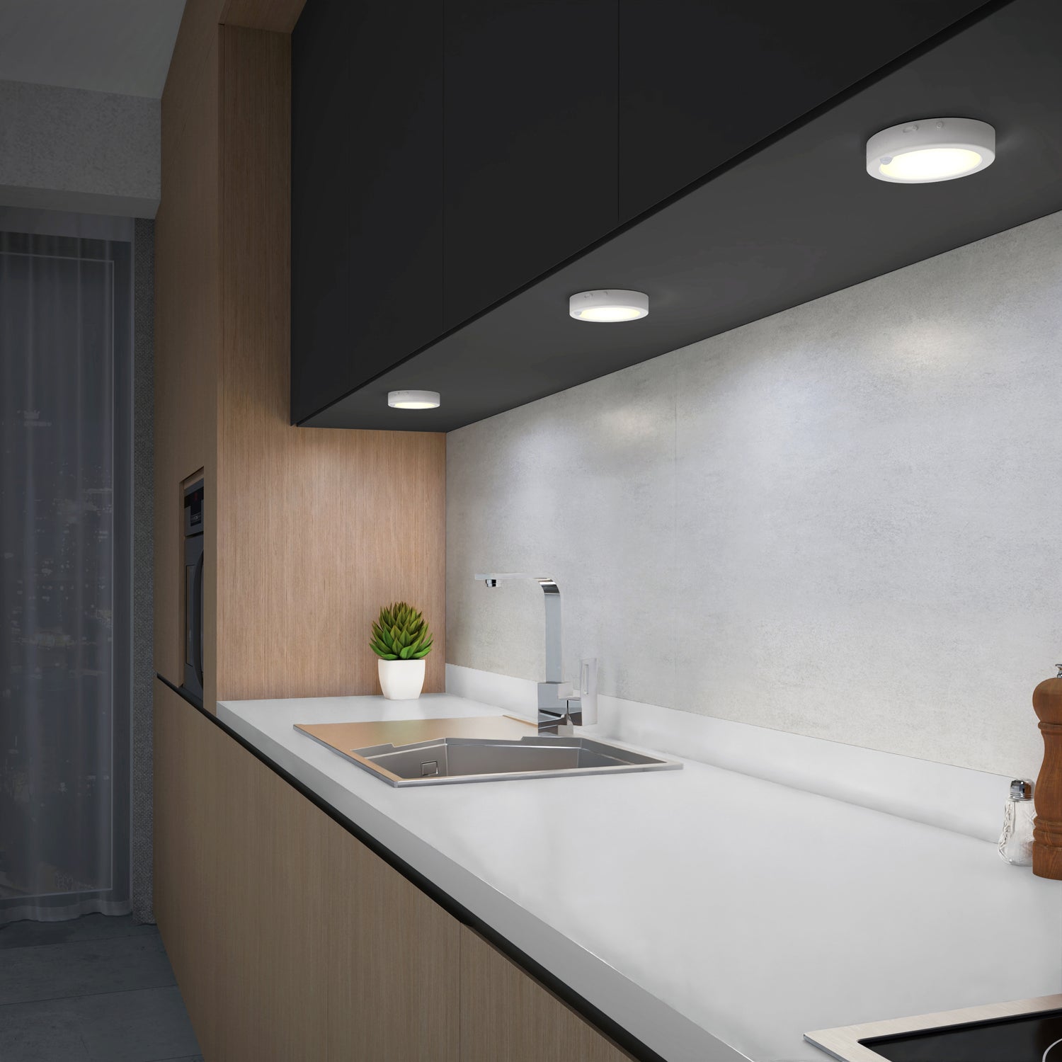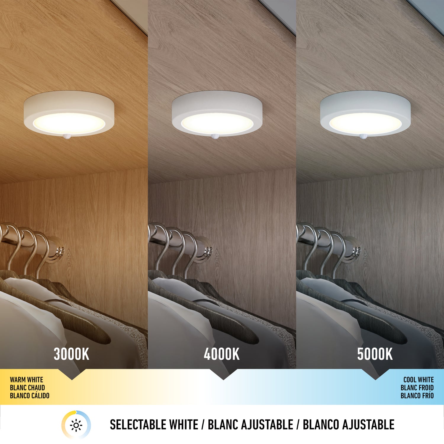 This set of three LED closet lights provides a practical and elegant lighting solution for walk-in closets. Install them above rods or dressers to create a stylish mini showroom.
