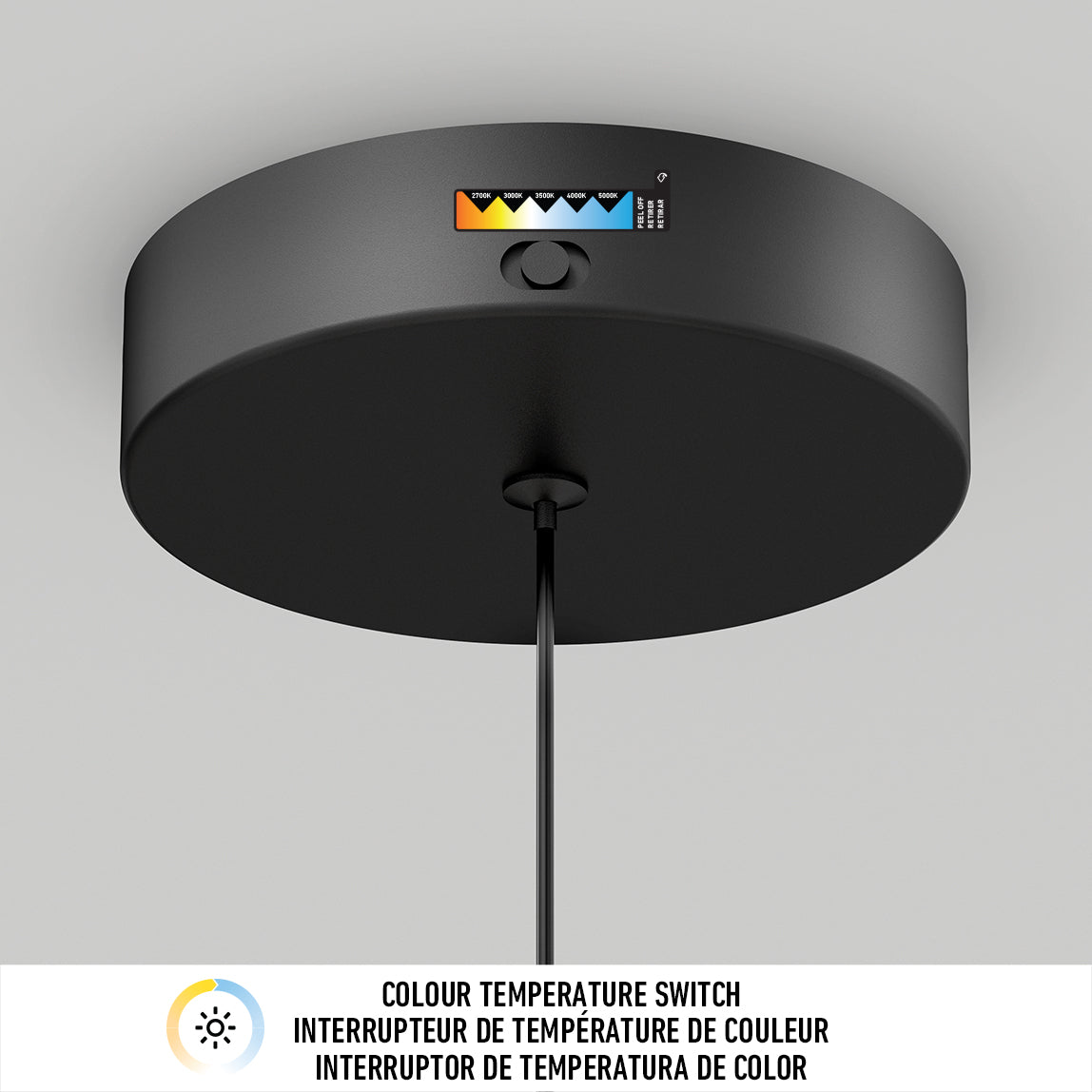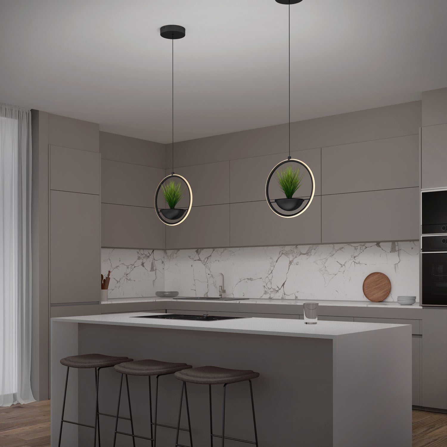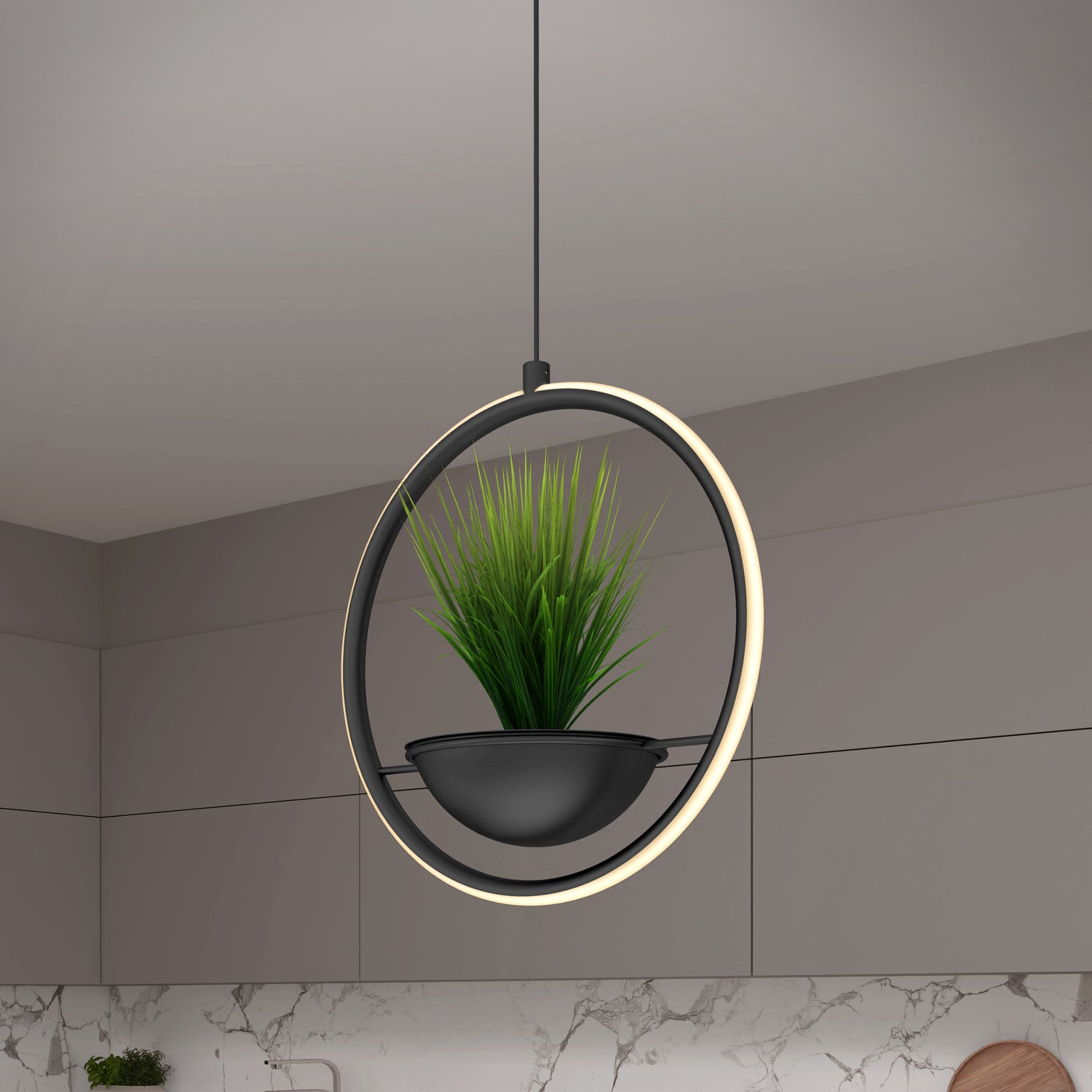 The Artika Colin LED modern planter pendant light 5 CCT features a circular black frame with an integrated LED ring and a central green potted plant, suspended by a black cord against a light gray background.