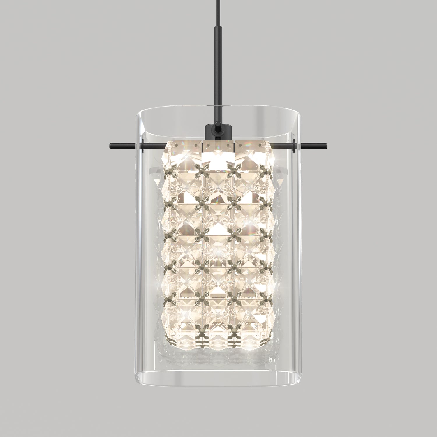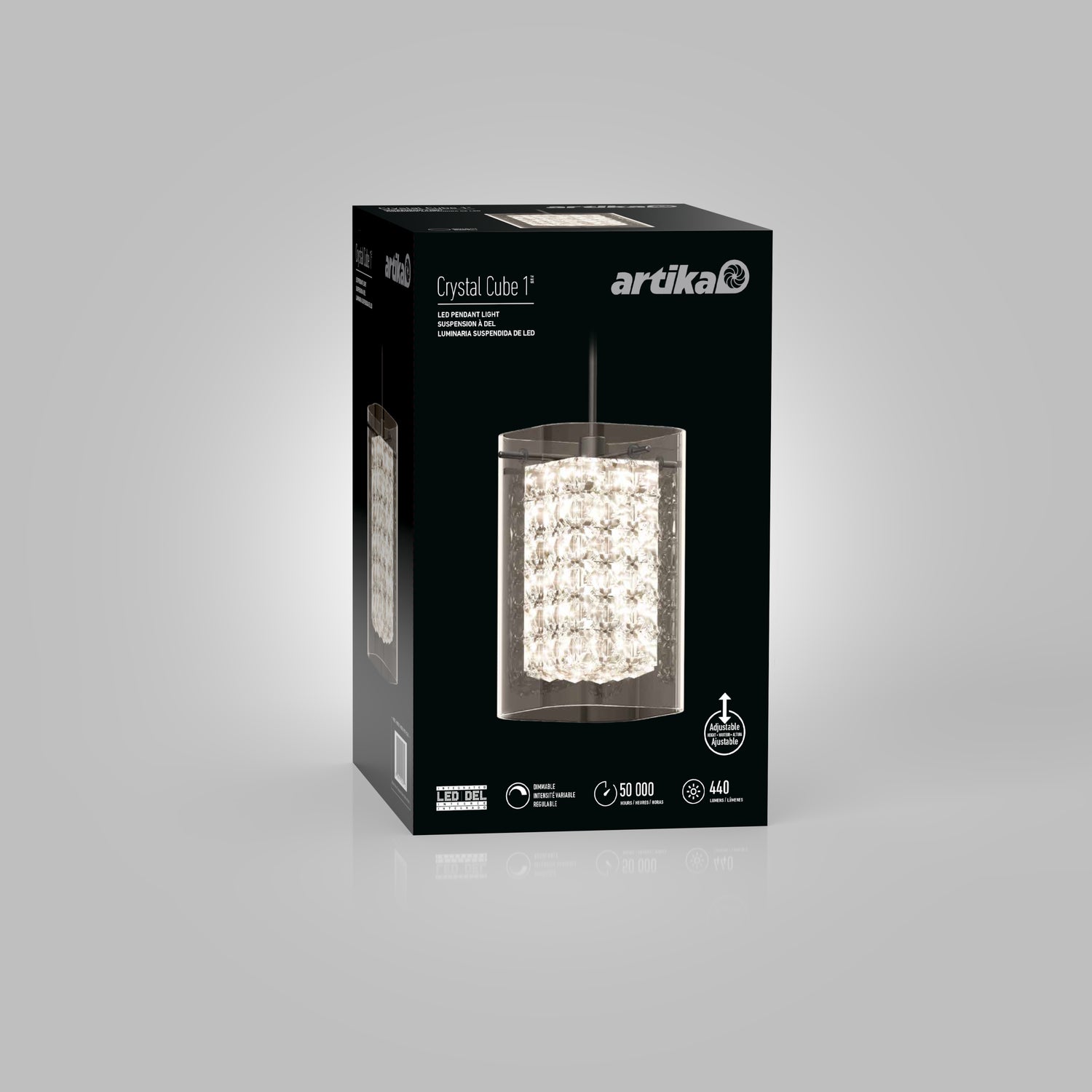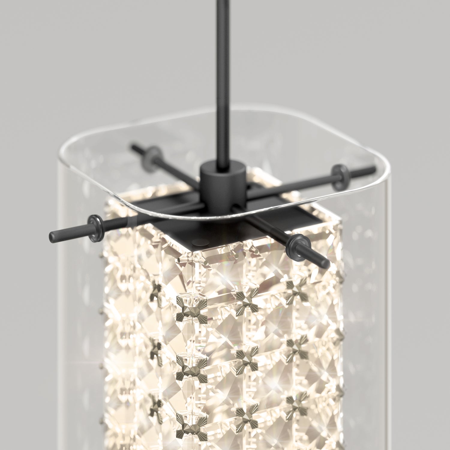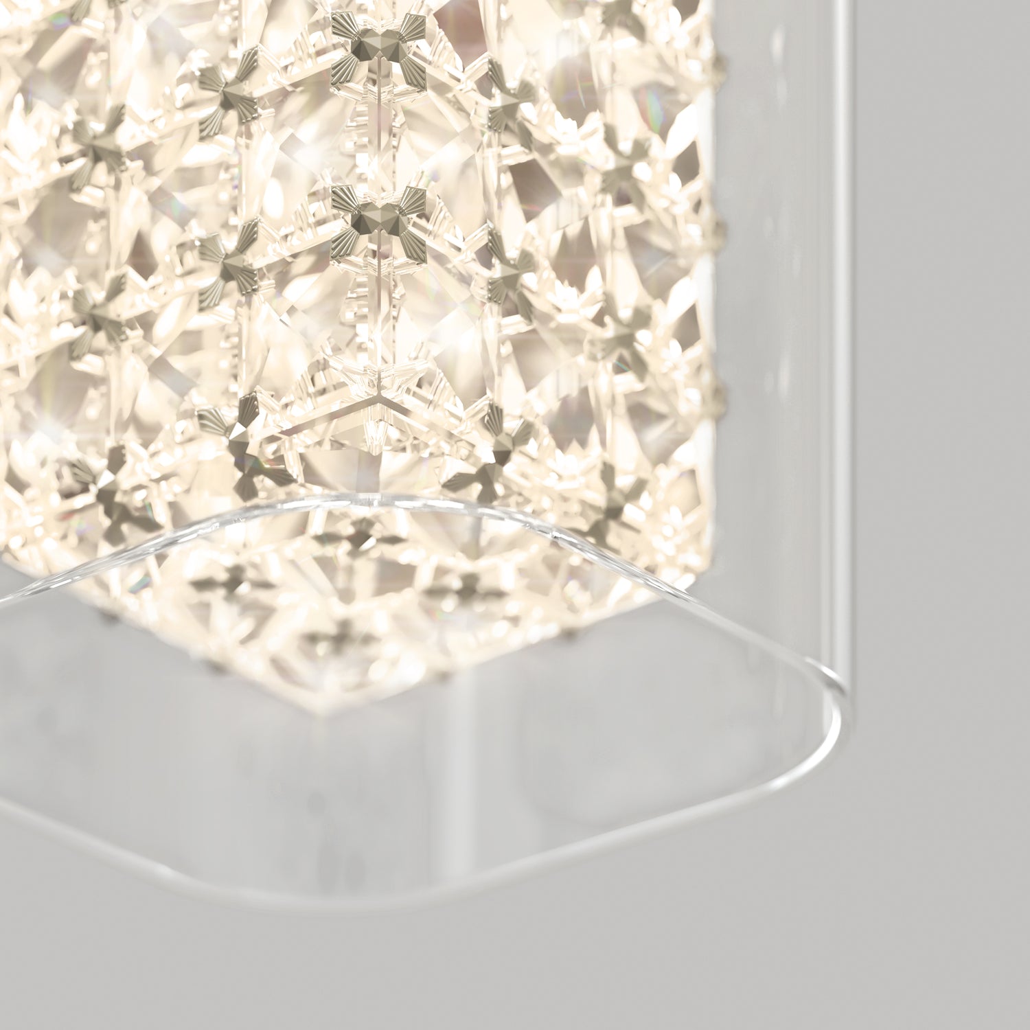 Blending modern design with luxurious detail, Crystal Cube 1 is an LED pendant defined by its shimmering glass diffuser. The style evokes the brilliance of diamonds, surrounded by a lightly smoked glass shell. Install it in a series above a kitchen island or bathroom vanity for a striking effect.