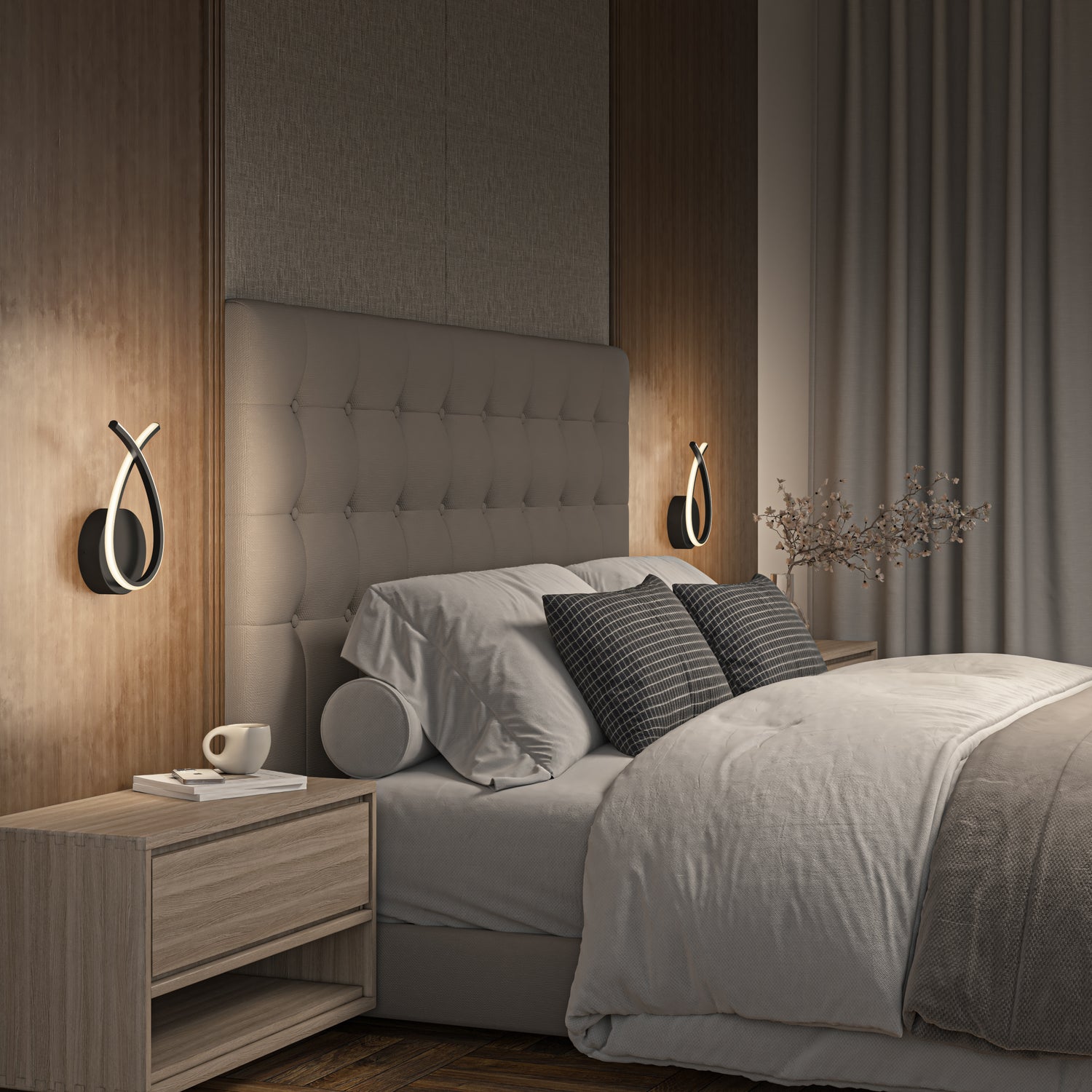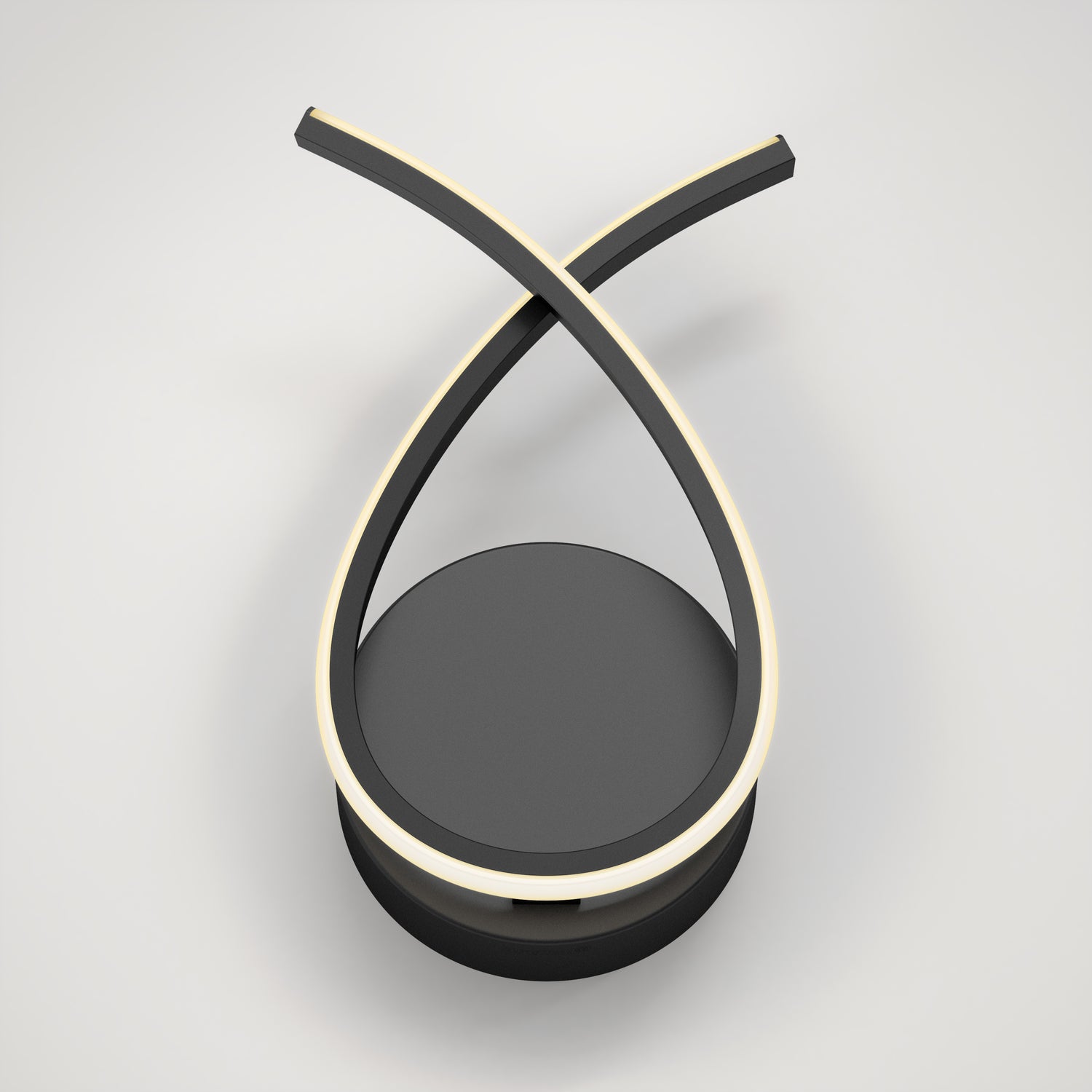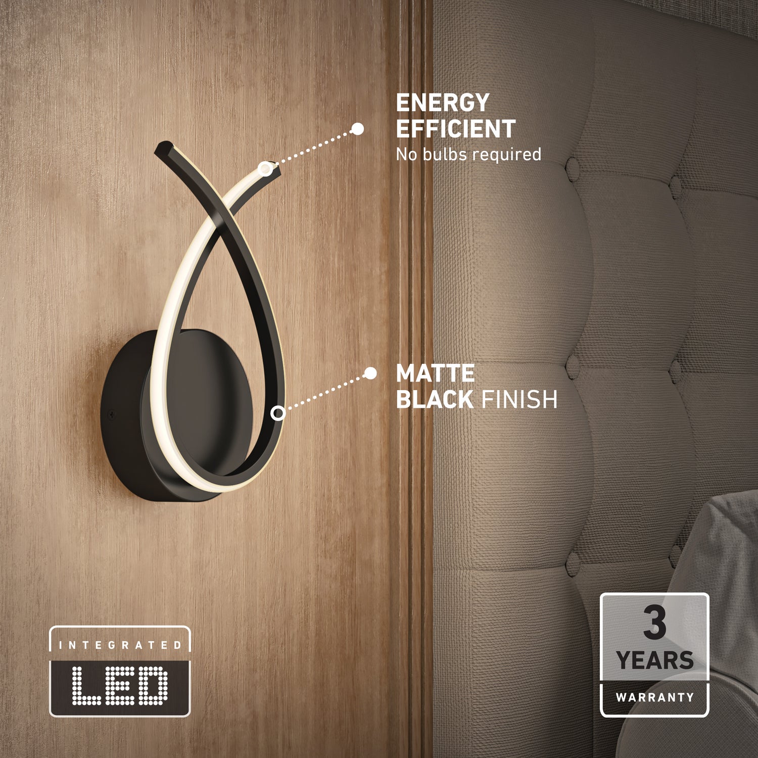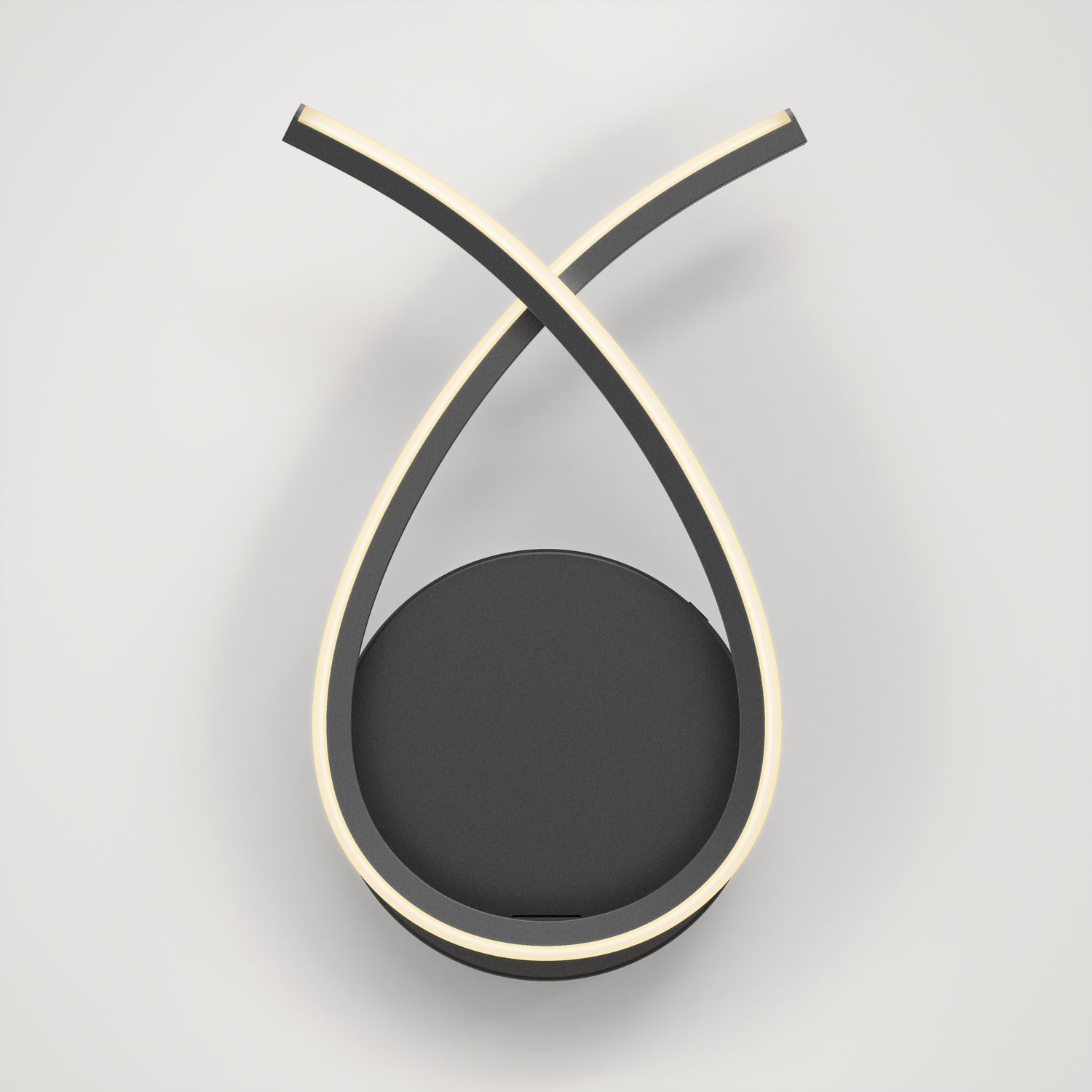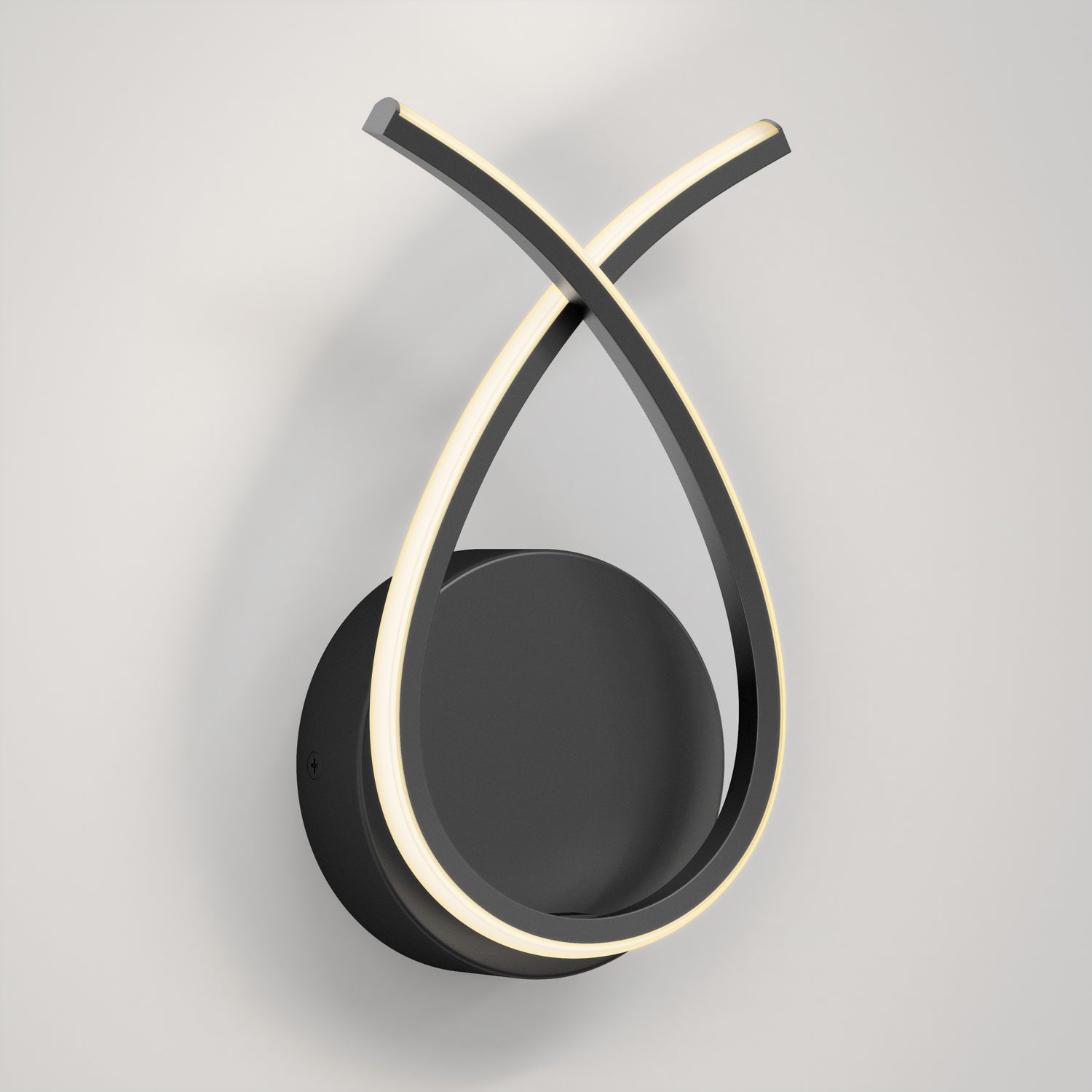 The Artika Gamma modern LED wall sconce 5 CCT features a circular black base and two intertwined curved light strips, offering a minimalist, sculptural design with adjustable warm illumination.