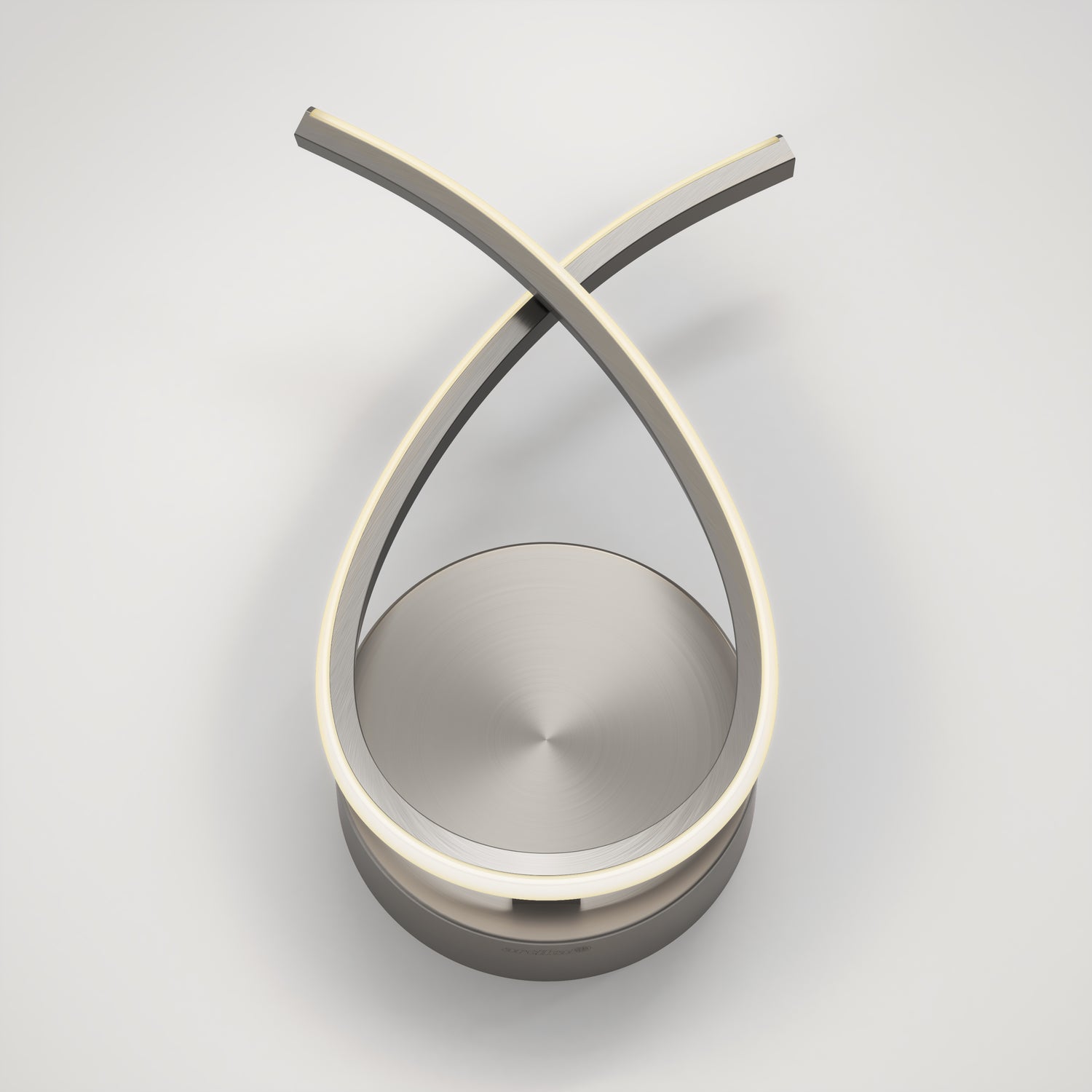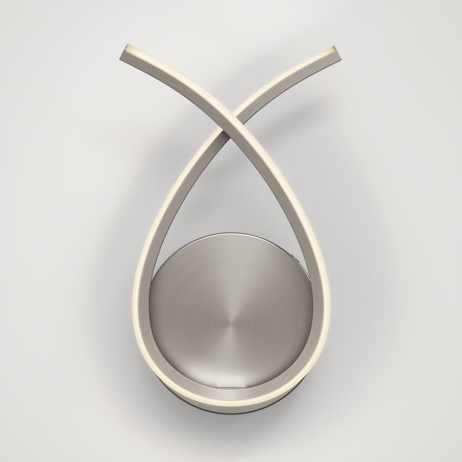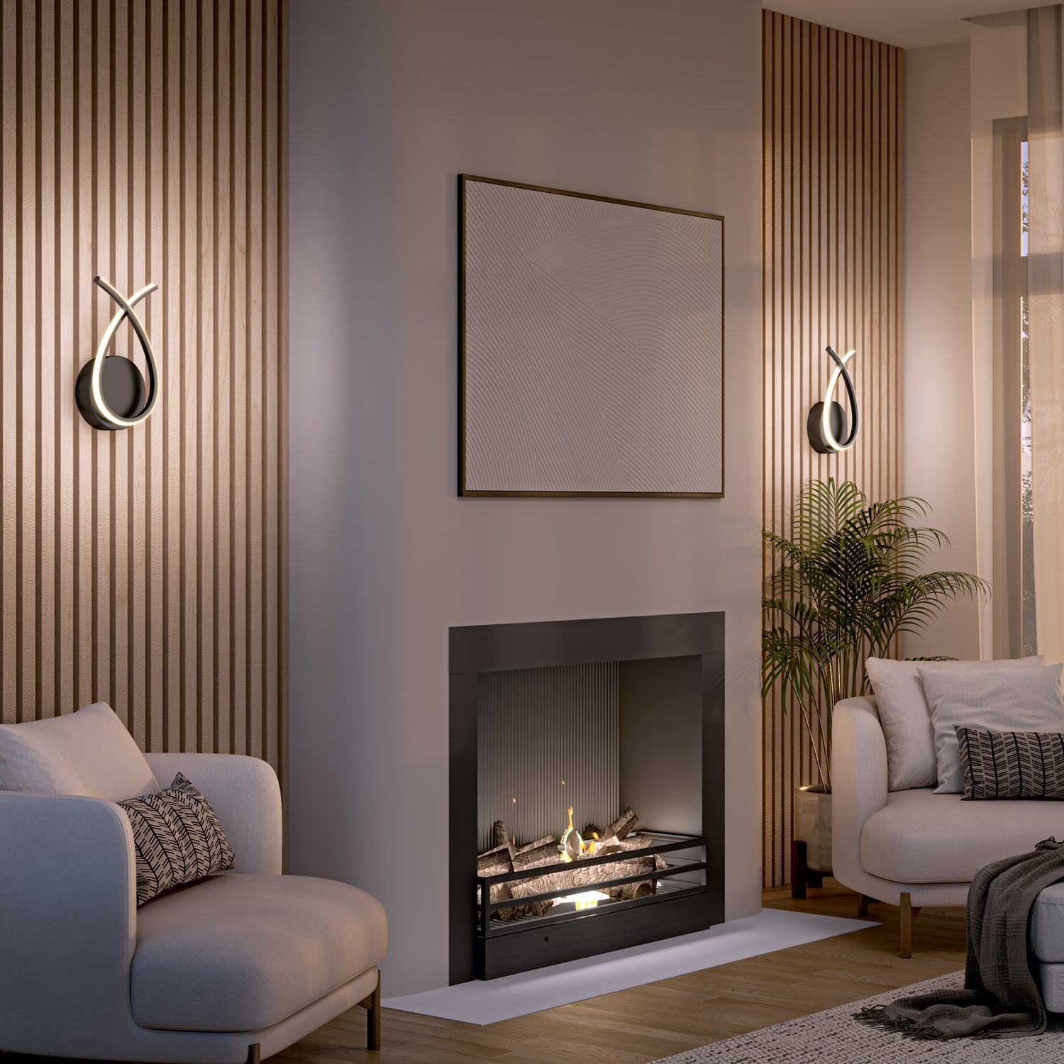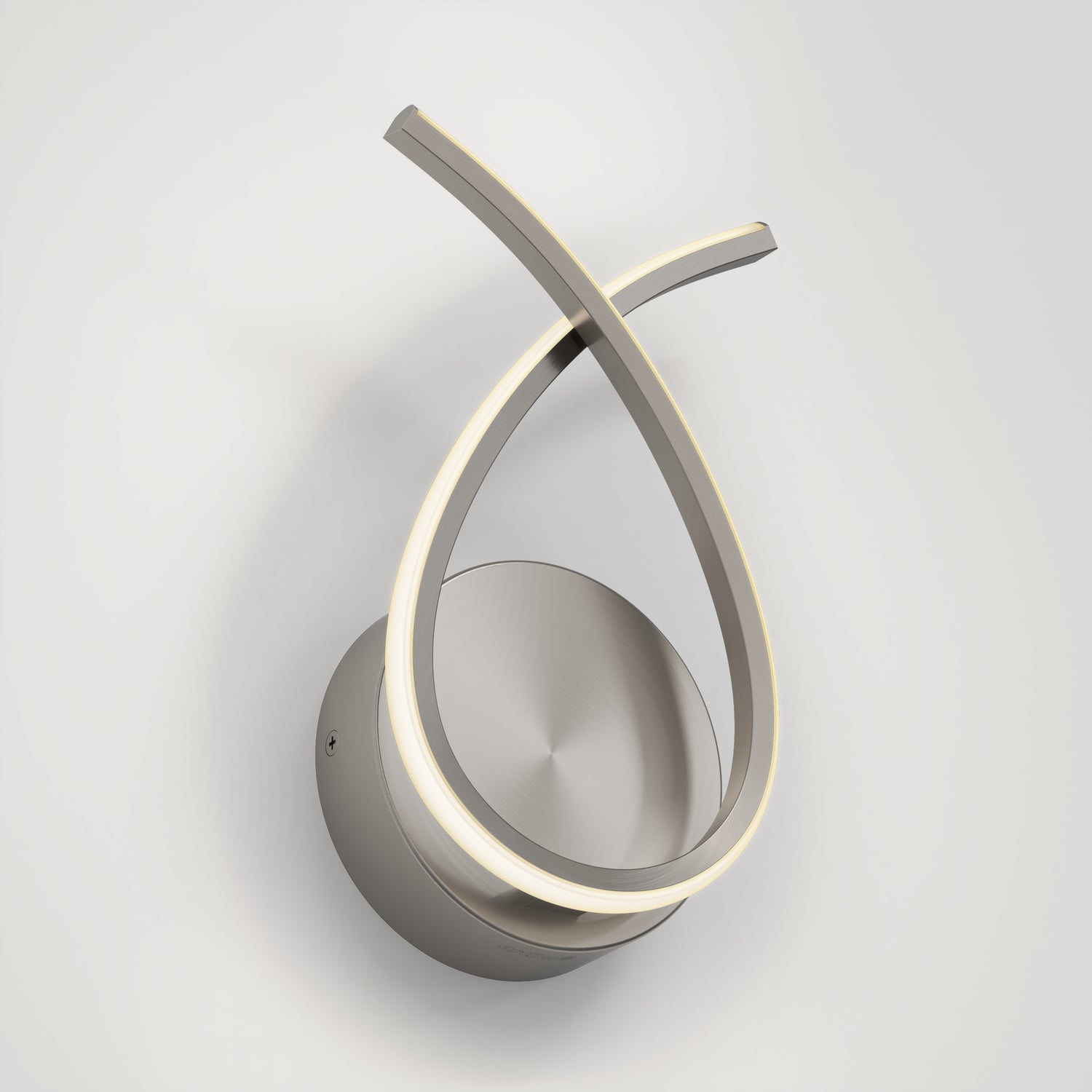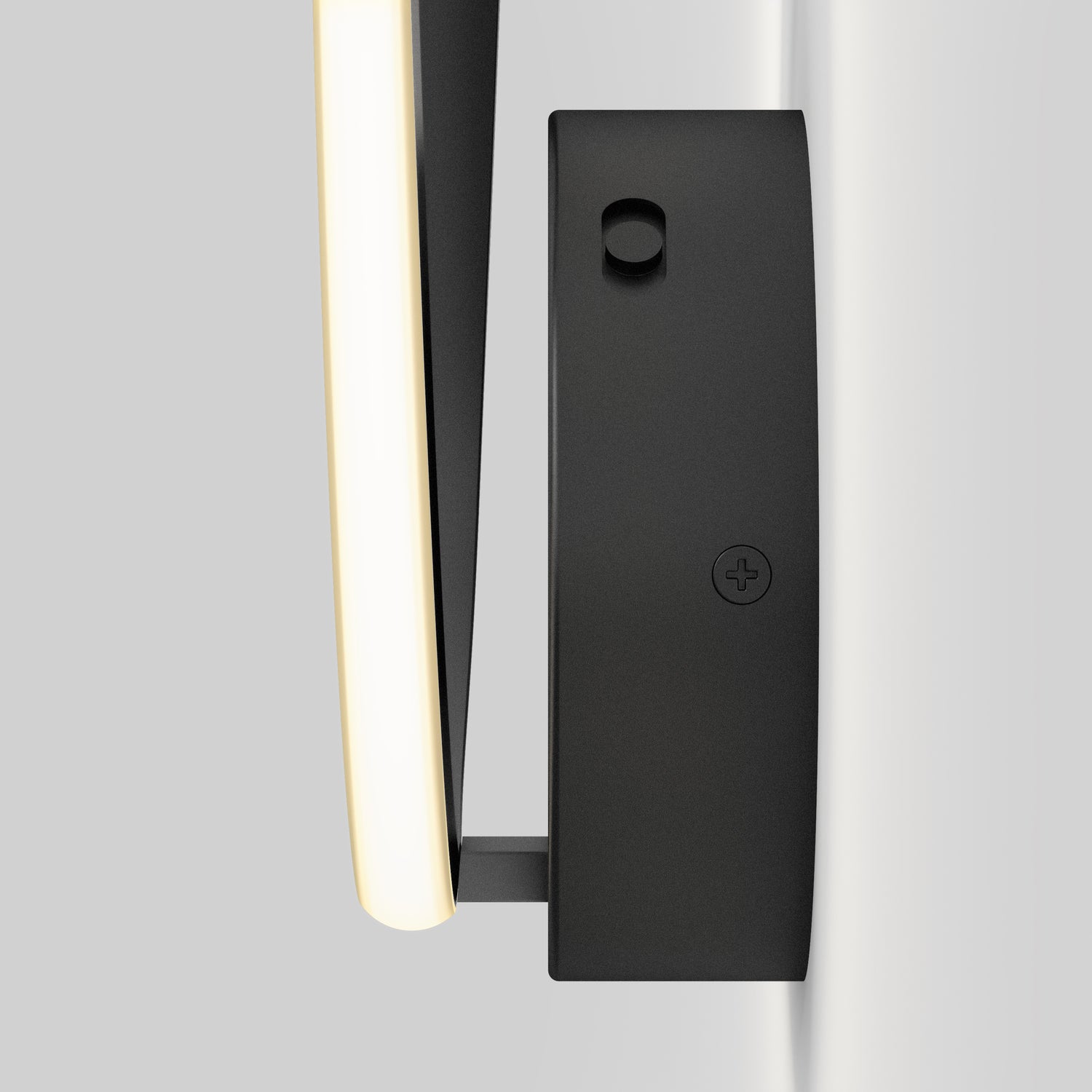 The Artika Gamma modern LED wall sconce 5 CCT features a circular black base and two intertwined curved light strips, offering a minimalist, sculptural design with adjustable warm illumination.