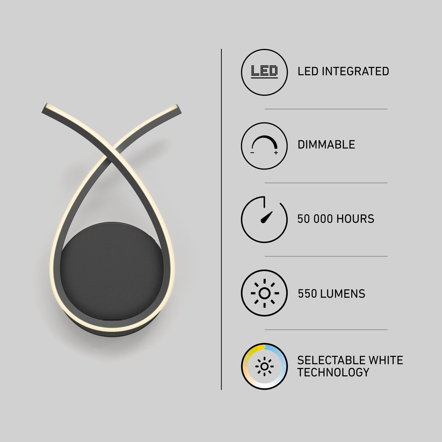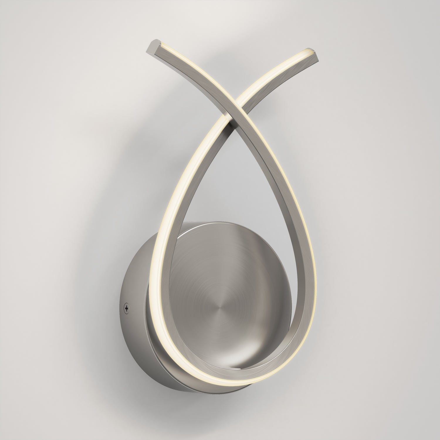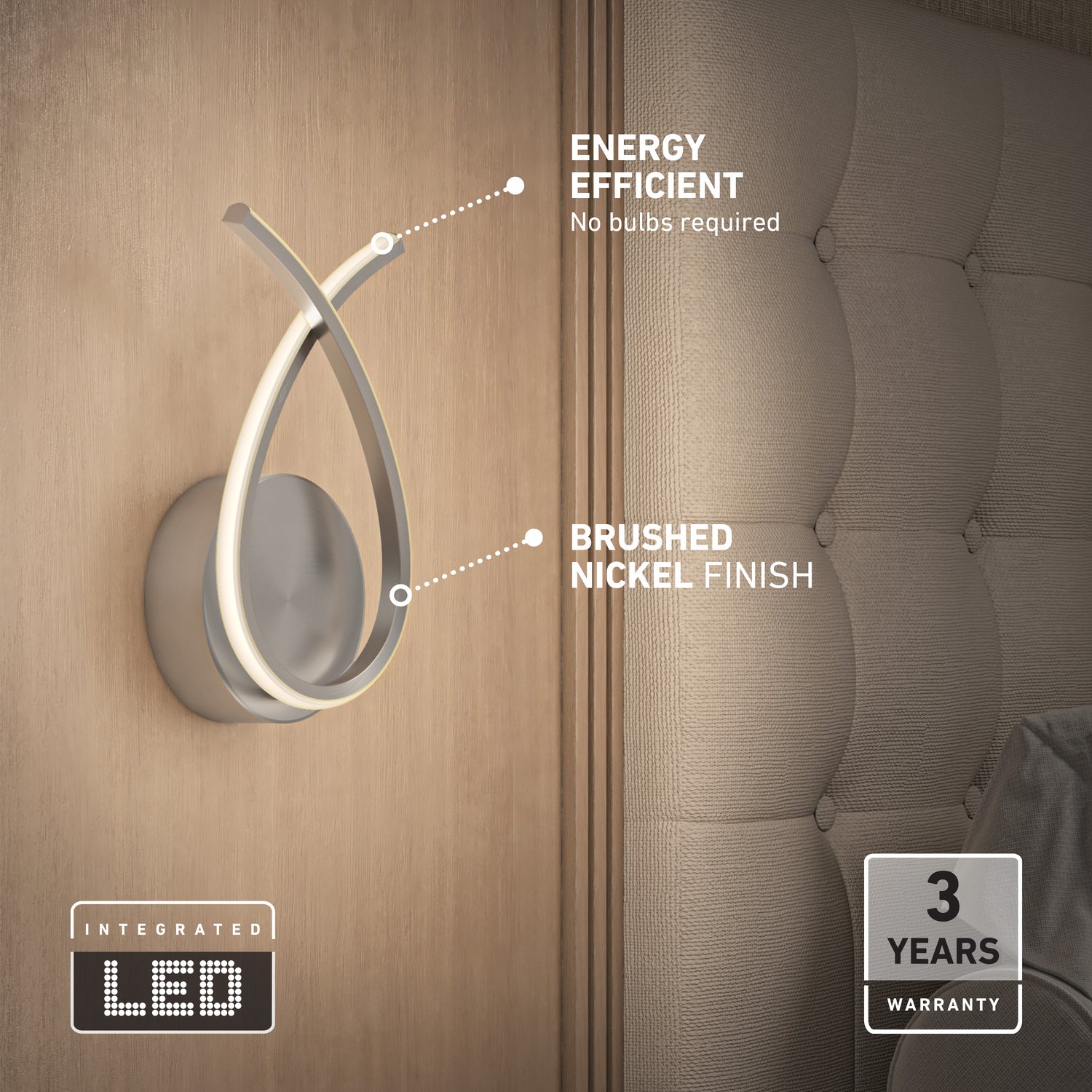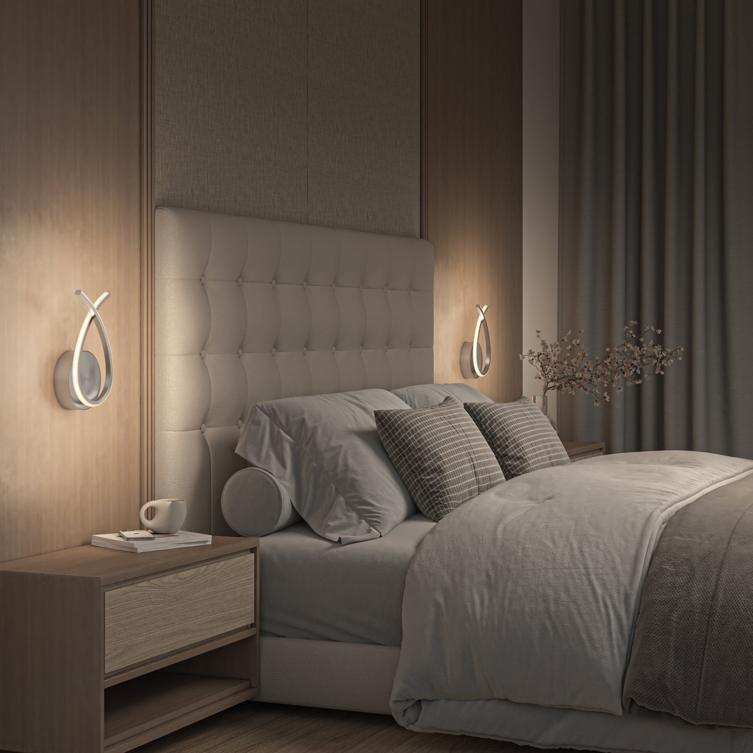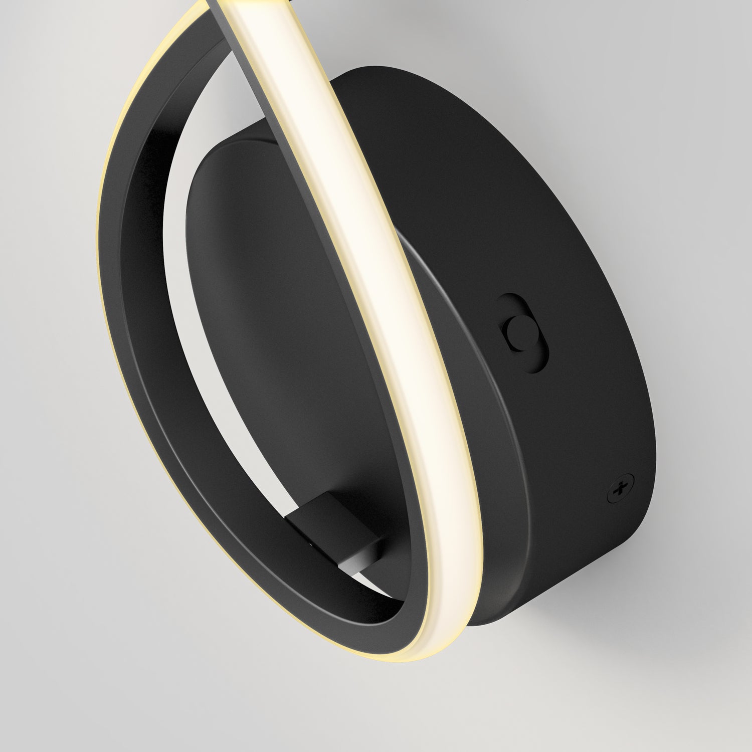 The Artika Gamma modern LED wall sconce 5 CCT features a circular black base and two intertwined curved light strips, offering a minimalist, sculptural design with adjustable warm illumination.