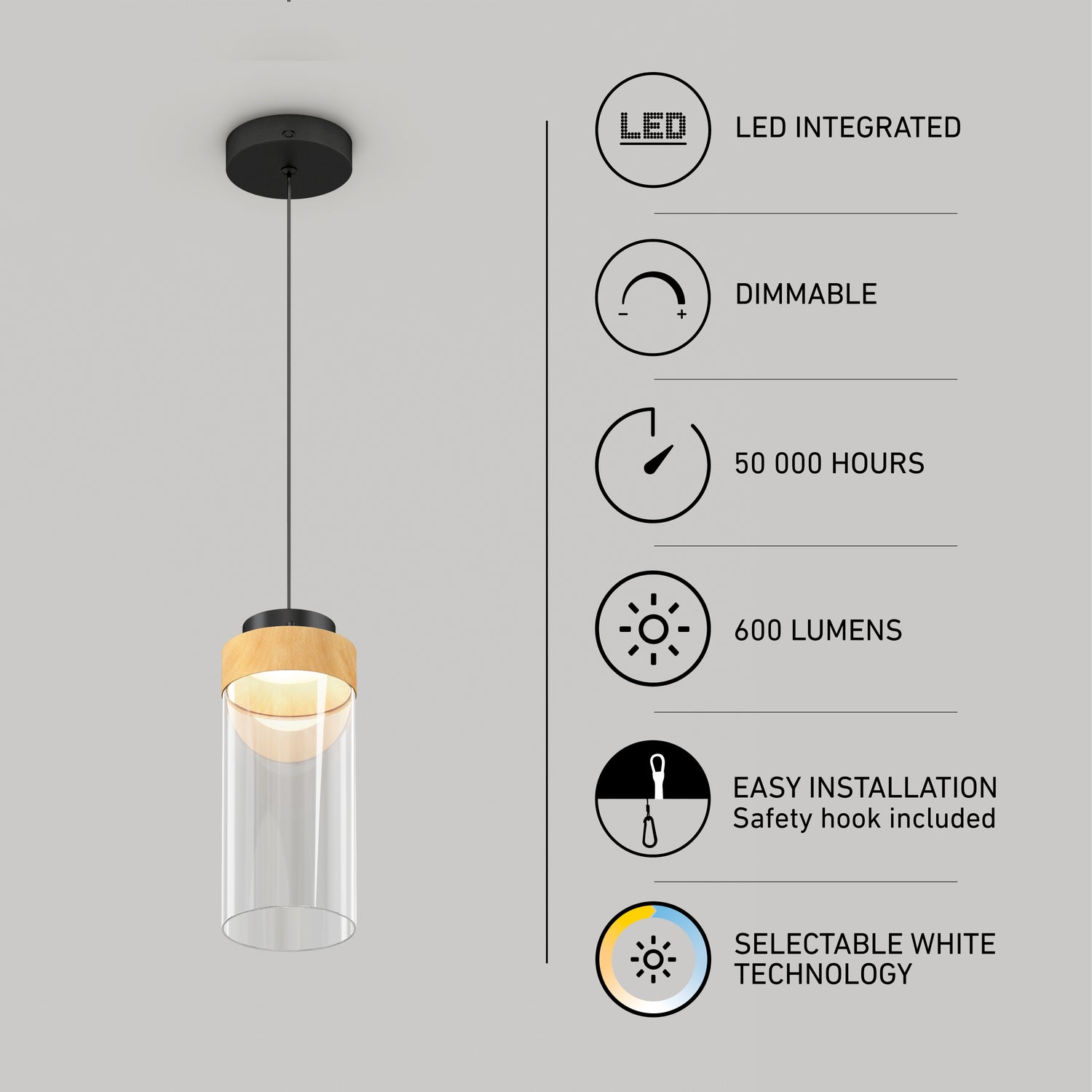 With 1,200 lumens, it offers strong illumination that can be adjusted with an LED-compatible dimmer. Easily choose from five white tones, ranging from warm to cool, to match the mood. Lifespan: 50,000 hours.