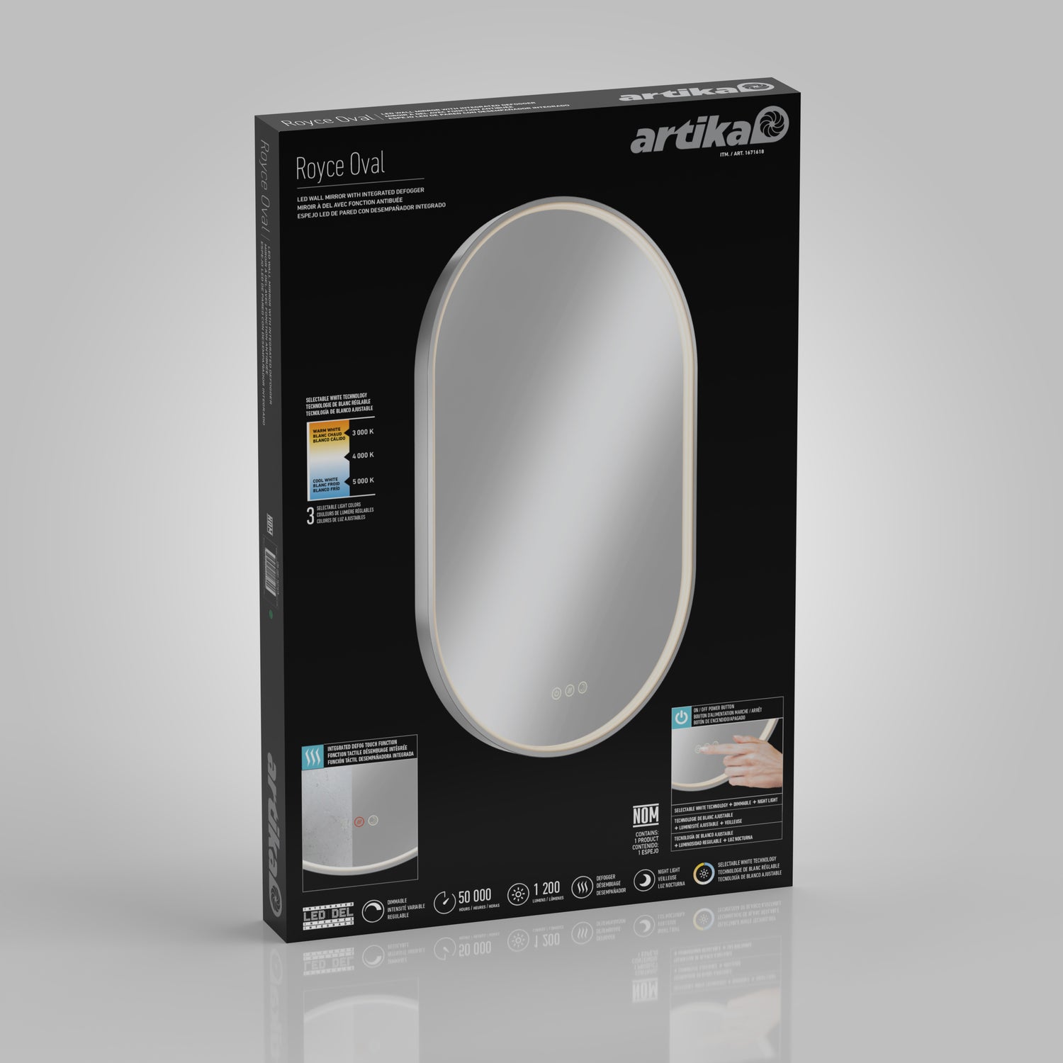 The Artika Royce LED mirror 3 CCT with defogger is a modern oval wall mirror featuring built-in edge LED lighting and three touch controls at the bottom, displayed against a plain light gray background.