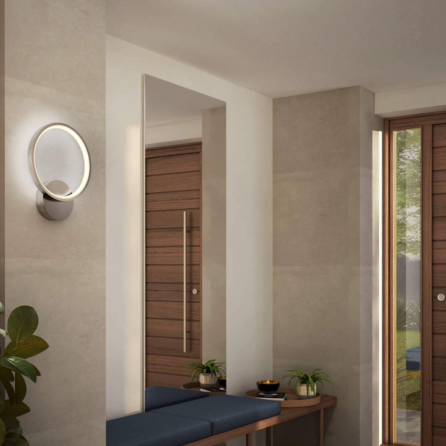 With its radiant ring and minimalist form, the Solis LED wall sconce fits naturally into contemporary spaces. It adds understated definition to your home’s design, whether placed beside the front door, along a column, or on an accent wall.