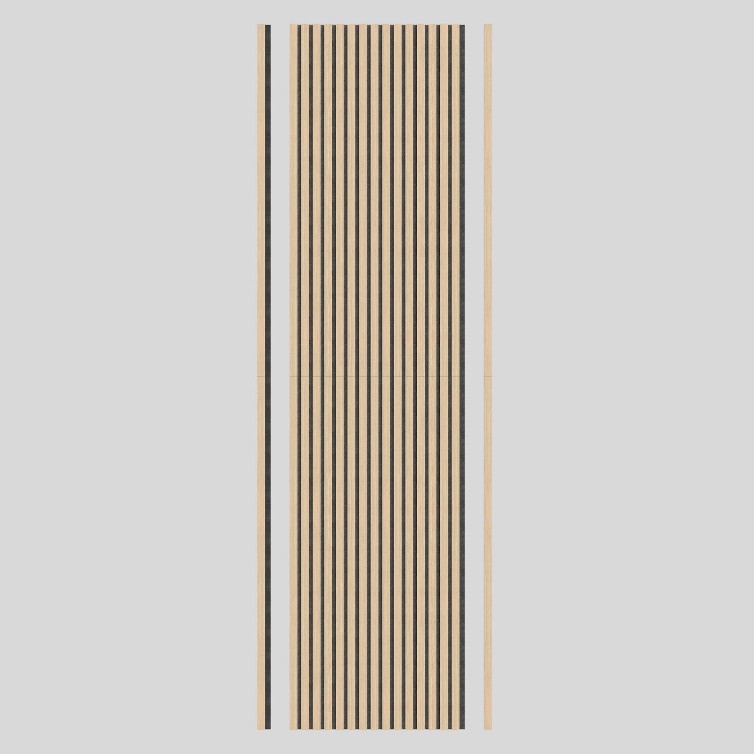 Made of MDF with veneer and felt, these panels install easily on walls and ceilings. The set includes two 8 ft x 2 ft panels, two finishing slats for the left and right edges, and 50 felt pads. For easier transport, the panels are folded in half in the box.