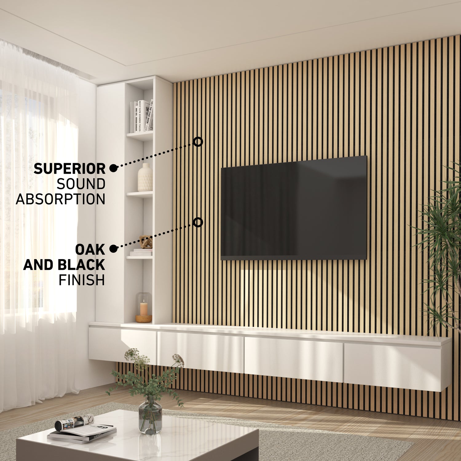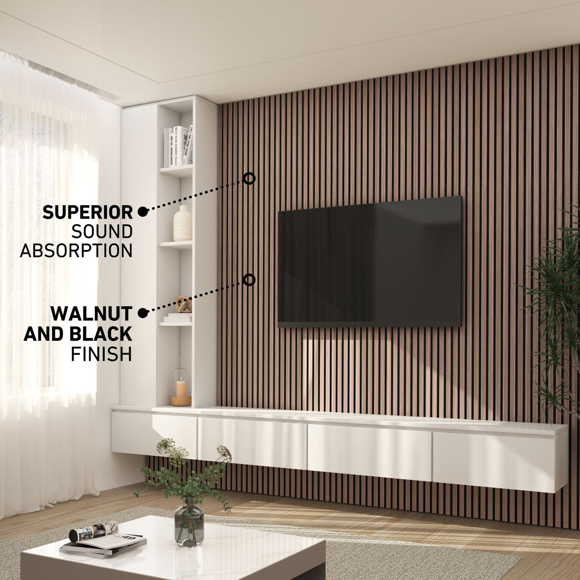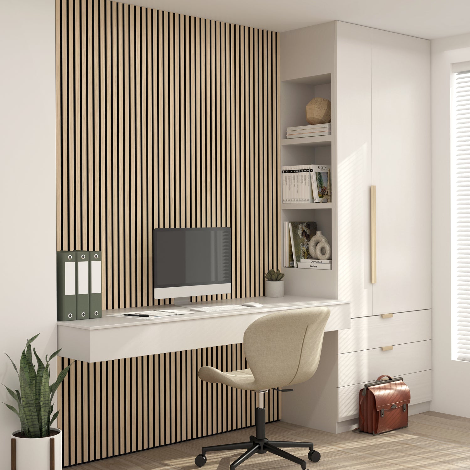 This slat panel set combines acoustic function with decorative appeal. Use it to define a home office or play area, frame your media setup, or create a statement headboard—while reducing echo and adding a refined wood finish to your space.