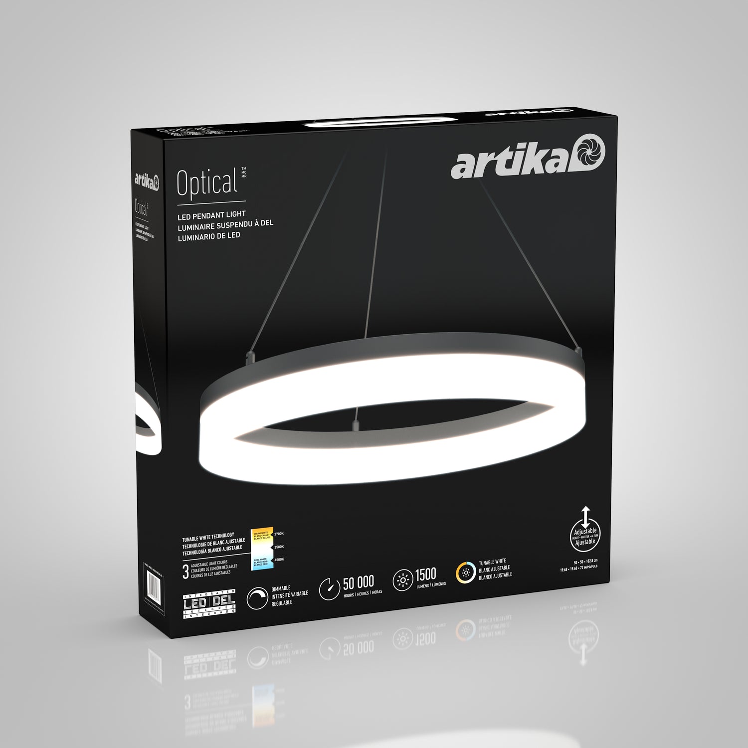The Artika Optical LED pendant light 3 CCT features a modern circular design with a black frame, a glowing white ring, and hangs from the ceiling on three thin cables attached to a central black mount.