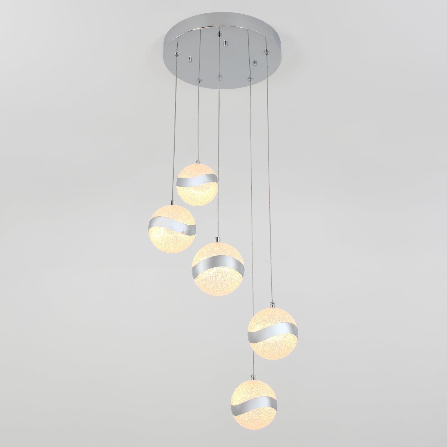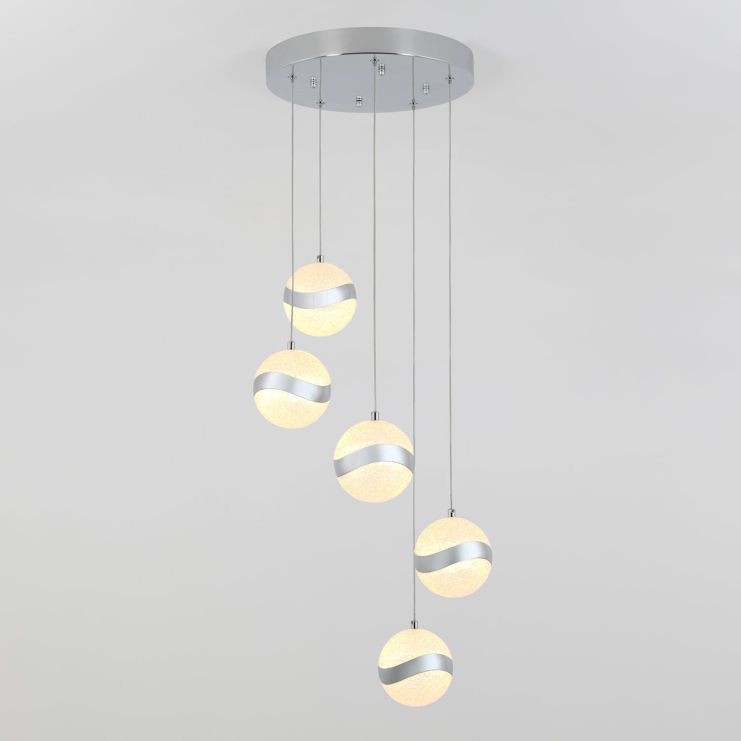 The Artika Wavey 5-light LED pendant features five frosted glass globes with silver bands, suspended at varied heights from a round, silver base for a striking modern look.