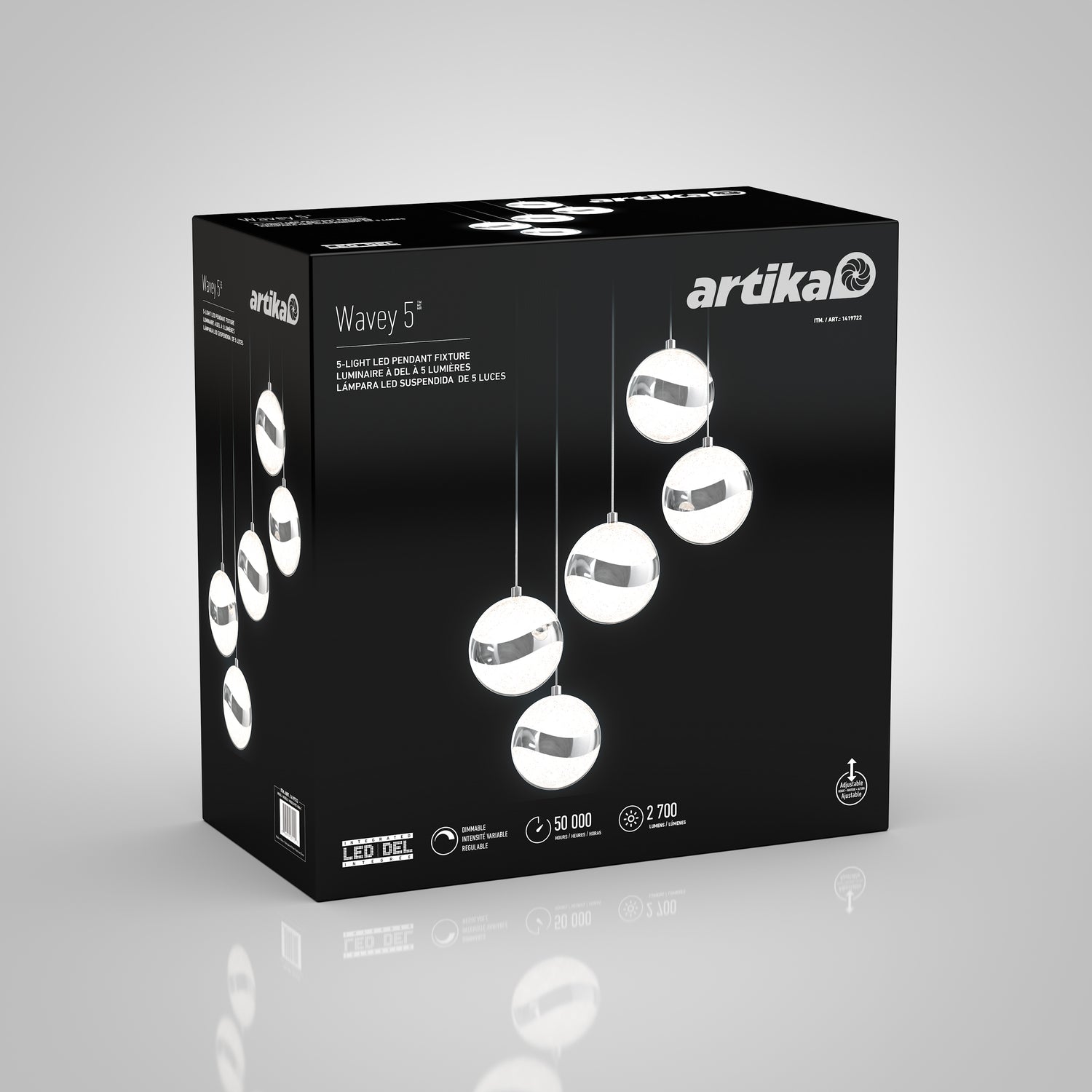 Suspended from the ceiling, Wavey 5 is a 5-light LED fixture that enhances your decor wherever it's installed. The curved, minimalist design evokes contemporary art and elevates any room in your home.Equipped with a dimmer, Wavey 5 lets you create rich lighting for all environments. With its chrome and glass design, it's an elegant addition to your place of work or play. It's easy to install and shines beautifully year after year thanks to its 50,000 hours of luminance.